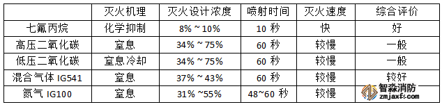 綜合以上參數(shù),可以發(fā)現(xiàn)七氟丙烷在滅火效能相較其他系統(tǒng)出色,應(yīng)用于配電室、機(jī)房等場所時(shí),能在很短時(shí)間內(nèi)將初始火情撲滅。