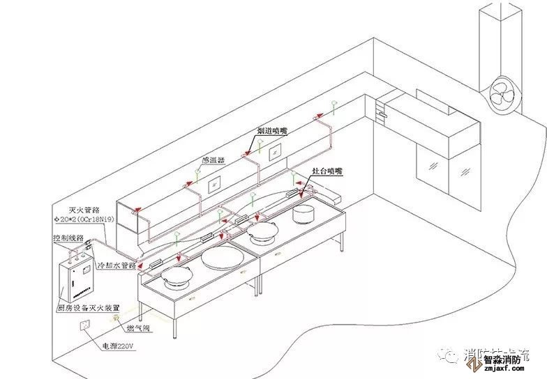 4、噴嘴應(yīng)設(shè)置在灶具上部的中心軸線處。噴嘴的布置應(yīng)使廚房設(shè)備滅火裝置所保護(hù)的面積內(nèi)不留空白,并應(yīng)均勻噴放滅火劑;