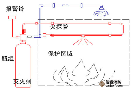 間接式:火探管與滅火介質(zhì)容器閥連接,延伸進(jìn)入保護(hù)空間,進(jìn)行火源探測(cè),遇火時(shí)火探管爆破,火探管中的壓力下降,發(fā)出報(bào)警信號(hào),啟動(dòng)容器閥,通過(guò)專設(shè)的釋放管及噴嘴把滅火劑釋放出來(lái),實(shí)現(xiàn)滅火。間接式適用于滅火空間較大的場(chǎng)所。