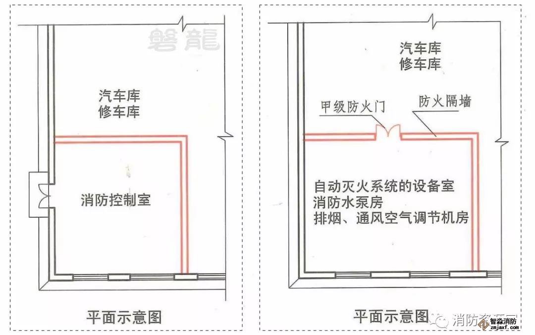 三、附設(shè)在汽車(chē)庫(kù)、修車(chē)庫(kù)內(nèi),且主要為其服務(wù)的消防控制室、自動(dòng)滅火系統(tǒng)的設(shè)備室、消防水泵房和排煙、通風(fēng)空氣調(diào)節(jié)機(jī)房等,應(yīng)采用防火隔墻和耐火極限不低于1.50h的不燃性樓板相互隔開(kāi)或與相鄰部位分隔,部分設(shè)備室的疏散門(mén)可以向汽車(chē)庫(kù)或修車(chē)庫(kù)開(kāi)啟,詳見(jiàn)圖示1。