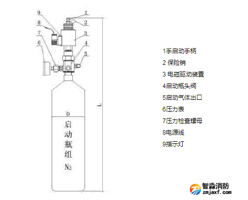 IG541混合氣體啟動(dòng)瓶組由貯存鋼瓶、瓶頭閥、壓力表、電磁驅(qū)動(dòng)裝置(帶手啟動(dòng)手 柄及保險(xiǎn)銷)組成,瓶?jī)?nèi)充裝氮?dú)猓∟2),作為驅(qū)動(dòng)氣體。瓶組容積有4L、7L、40L三種規(guī)格。4L、7L有標(biāo)準(zhǔn)的瓶組架,40L可安裝于滅火劑瓶組架 兩側(cè),也可定制瓶組架。啟動(dòng)瓶組有自動(dòng)和應(yīng)急操作兩種啟動(dòng)方式。自動(dòng)啟動(dòng)受來(lái)自火災(zāi)自動(dòng)報(bào)警控制器的控制,電磁驅(qū)動(dòng)裝置動(dòng)作,啟動(dòng)瓶組開啟,實(shí)現(xiàn)自動(dòng)啟 動(dòng)。若自動(dòng)啟動(dòng)失靈或無(wú)法實(shí)現(xiàn),需進(jìn)行機(jī)械應(yīng)急操作,拔下電磁驅(qū)動(dòng)裝置上保險(xiǎn)銷(見圖),用手按下手啟動(dòng)手柄(見圖),啟動(dòng)瓶組開啟,實(shí)現(xiàn)應(yīng)急操作啟動(dòng)。 啟動(dòng)瓶組的壓力表后部有檢測(cè)壓力的螺母,在檢測(cè)啟動(dòng)瓶組壓力時(shí),用扳手按逆時(shí)針方向旋轉(zhuǎn)螺母至壓力顯示,檢測(cè)完畢后,按順時(shí)針方向旋緊,然后逆時(shí)針旋松壓 力表,放掉壓力表內(nèi)氣壓,使指針回零,再把壓力表復(fù)位。