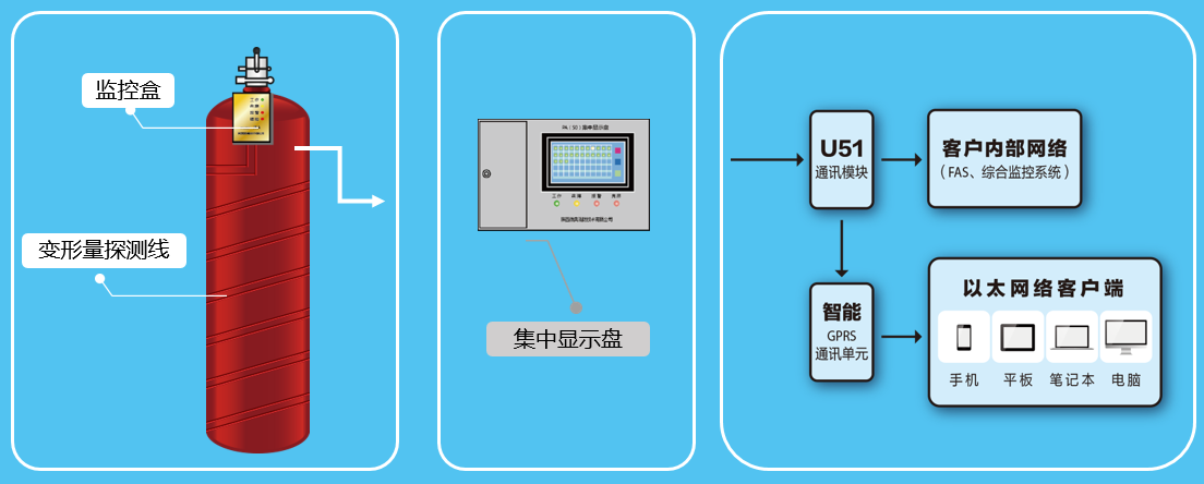 消防氣體鋼瓶爆裂預警探測裝置系統(tǒng)構成由變形量探測線、監(jiān)控盒、主動泄放裝置、集中顯示盤、報警網(wǎng)絡組成。